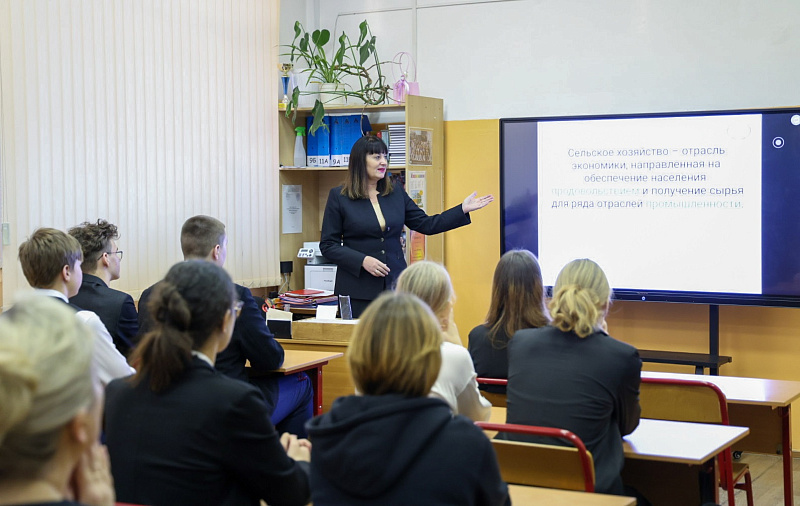 Урок для учащихся Эколого-биологического лицея имени академика Н.П. Лавёрова провела министр агропромышленного комплекса и торговли Архангельской области Ирина Бажанова.