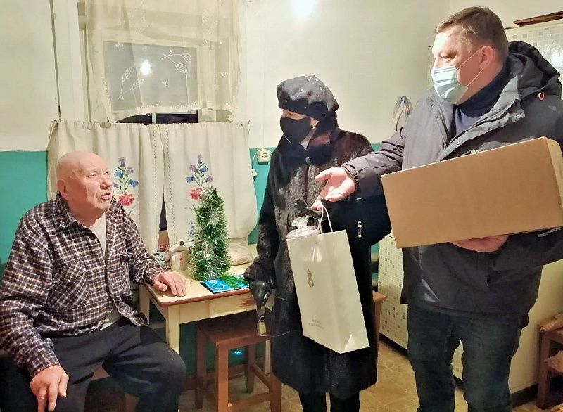 Глава городского поселения «Кулойское» Михаил Чернушенко, депутат Собрания депутатов Вельского муниципального района Наталия Карпова, председатель Совета депутатов городского поселения «Кулойское» Татьяна Борская поздравили с Новым годом единственного ветерана Великой Отечественной войны, проживающего в Кулое, Михаила Александровича Жаворонкова.