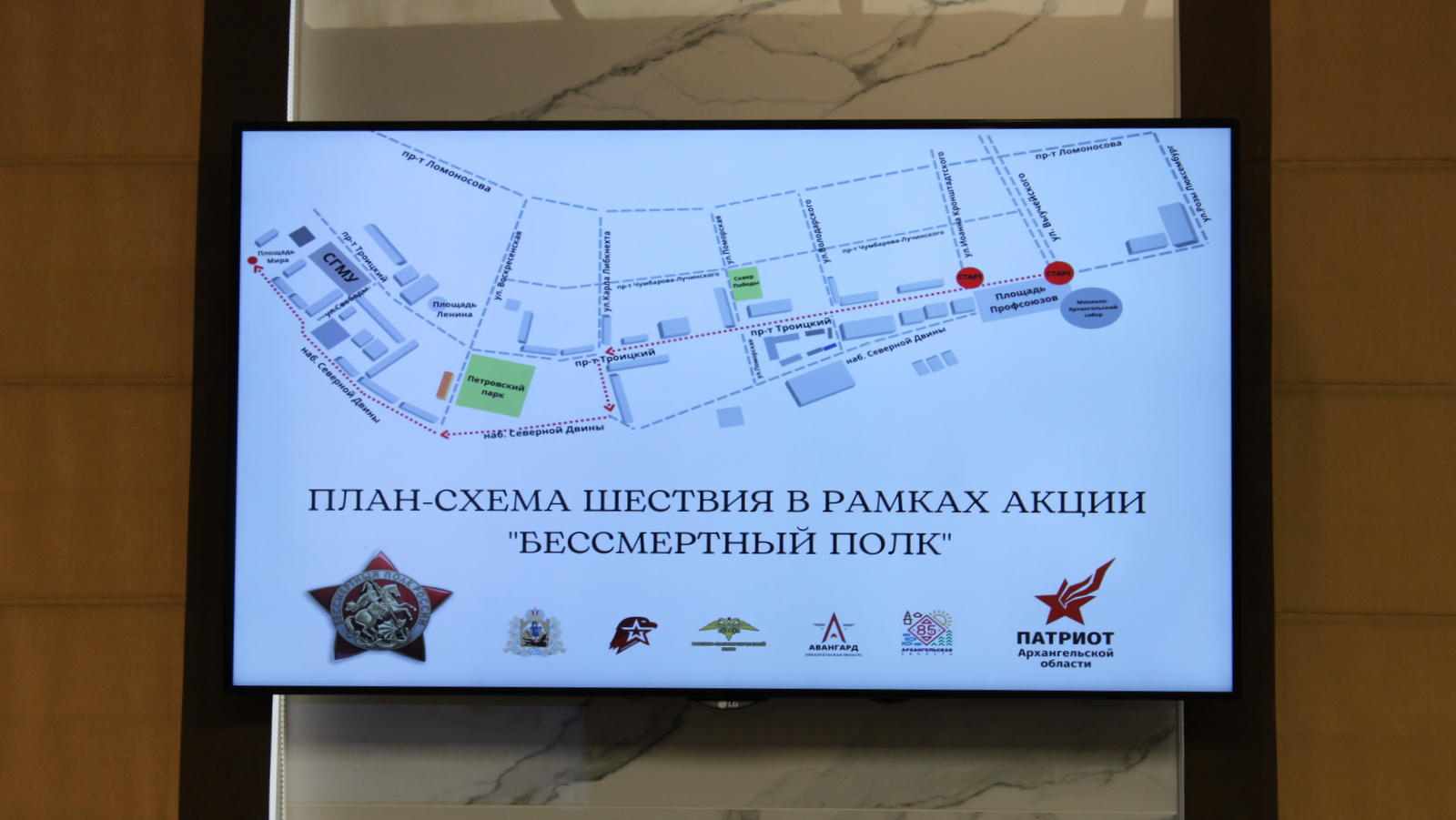 В 10:00 начнется парад, в торжественном марше пройдут войска Архангельского гарнизона, колонна механизированных расчетов, состоящая примерно из 30 единиц техники, и сводный духовой оркестр. Около 11:20 запланировано начало шествия «Бессмертного полка», в котором примут участие до 25 тысяч горожан.