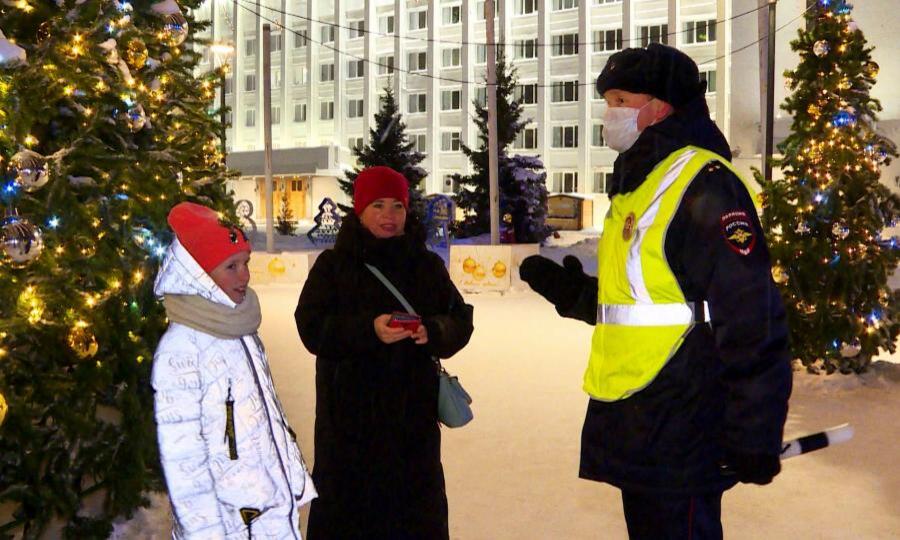 В канун Рождества у центральной елки Архангельска многолюдно. Дети и взрослые фотографируются на фоне ледяных фигур, катаются на гужевых повозках. А сотрудники областной Госавтоинспекции проверяют знания о безопасности на дорогах. Вопросы самые простые — на какой свет светофора переходить дорогу; как и где переходить, если светофора нет. В подарок дети получили светоотражатели. Родителей Насти Львовой сотрудники Госавтоинспекции похвалили за выбор куртки. В ней девочка сама как светоотражатель, а значит всегда видна на дороге.