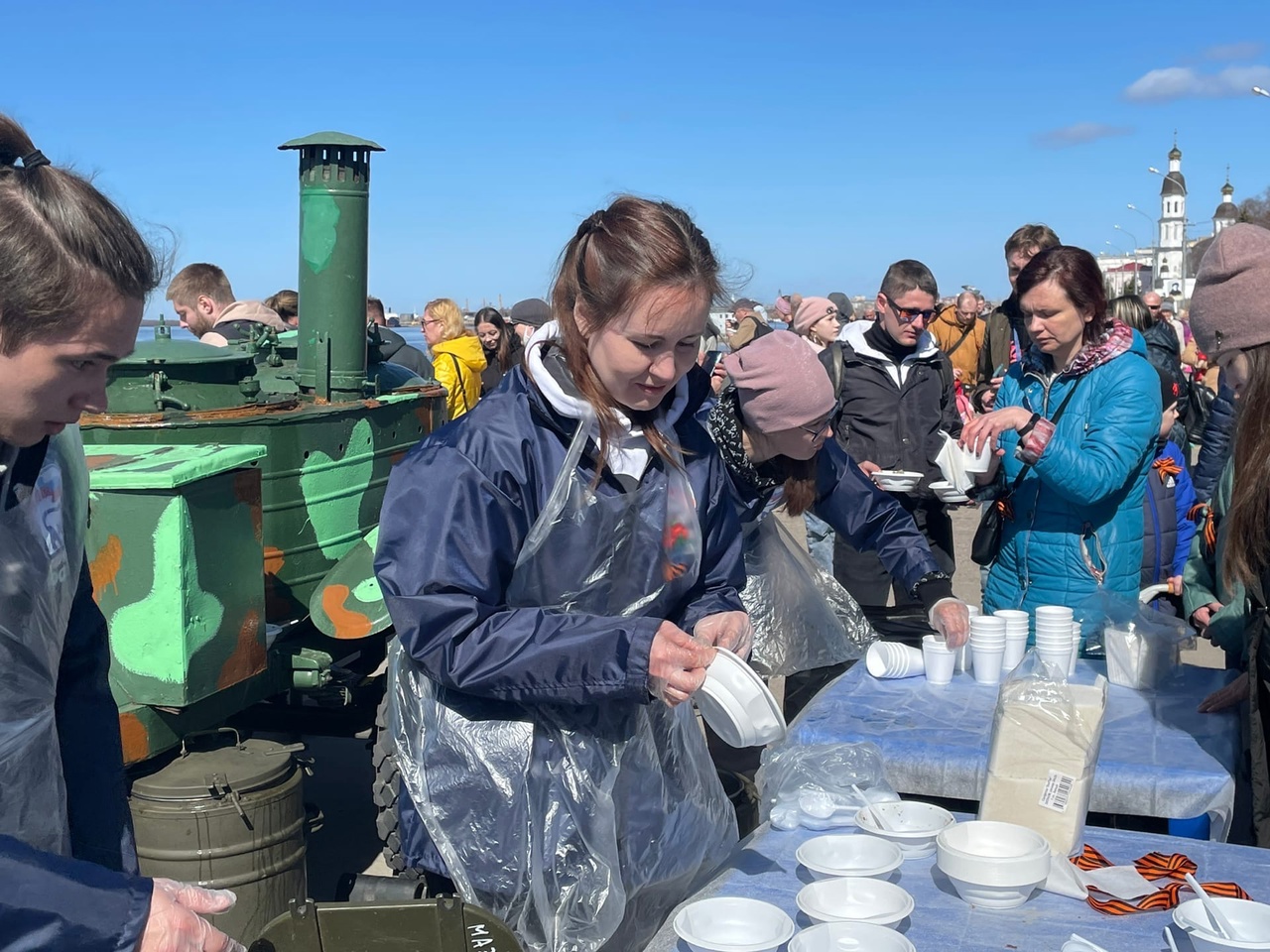 С 12 часов в Архангельске работают полевые кухни Всем желающим предлагают традиционную солдатскую гречневую кашу с тушёнкой и горячий чай.