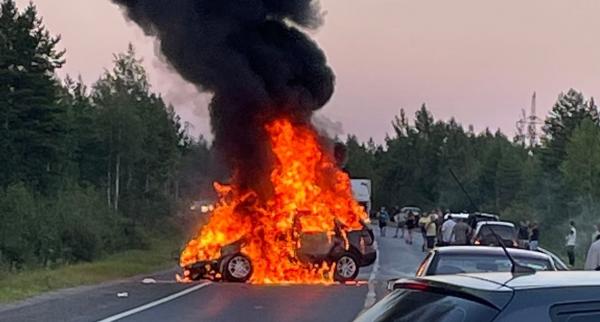 На трассе Архангельск - Северодвинск ДТП с тремя автомобилями. Одна машина сгорела