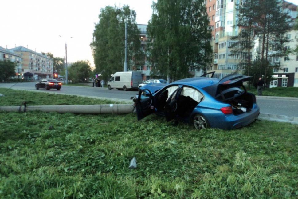 Накануне вечером 8 июня на перекрестке с круговым движением Воскресенская и Обводного канала в Архангельске водитель иномарки «BMW» не справился с управлением и врезался в фонарный столб.