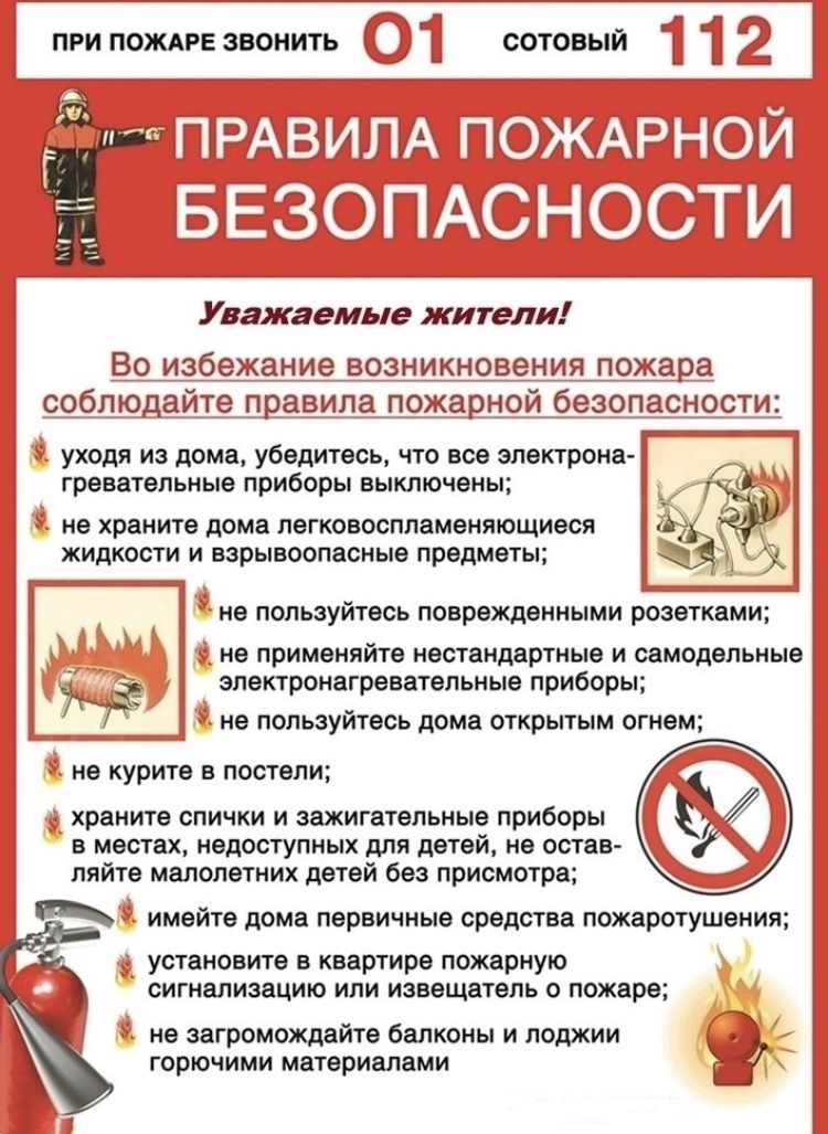 не оставляйте без присмотра включенные в электросеть бытовые электроприборы; эксплуатируйте электроприборы в соответствии с требованиями инструкций по эксплуатации заводов-изготовителей; следите за неисправностью электропроводки, не пользуйтесь поврежденными электроприборами, электророзетками; не включайте в одну электророзетку одновременно несколько мощных потребителей электроэнергии, перегружая электросеть; не эксплуатируйте электросветильники со снятыми защитными плафонами; не пользуйтесь в помещении источниками открытого огня (свечи, спички, факела и т.д.); в квартирах жилых домов и комнатах общежитий запрещается устраивать различного рода производственные и складские помещения, в которых применяются и хранятся пожароопасные и взрывопожароопасные вещества и материалы; запрещается хранить в квартирах и комнатах общежитий баллоны с горючими газами, емкости с легковоспламеняющимися и горючими жидкостями и т.д.; запрещается загромождать пути эвакуации (лестничные клетки, лестничные марши, коридоры) различными материалами, изделиями, оборудованием; запрещается устраивать на лестничных клетках и поэтажных коридорах кладовые (чуланы), а также хранить под лестничными маршами и на лестничных площадках вещи, мебель и горючие материалы.