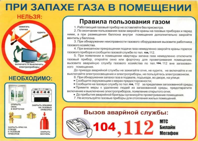 - вызвать аварийную службу газового хозяйства по телефону (вызывать вне загазованного помещения);