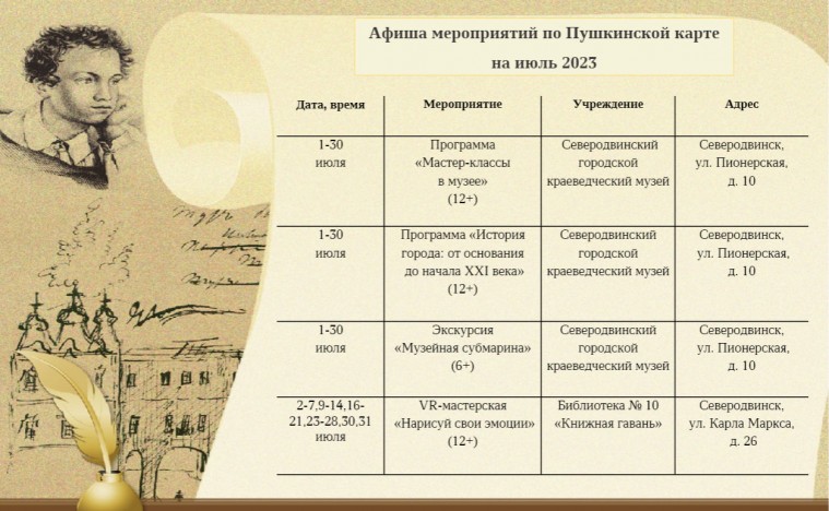 Учреждения культуры Северодвинска приглашают девушек и юношей в июле на кинопоказы, экскурсии и мастер-классы, которые можно посетить по программе «Пушкинская карта».