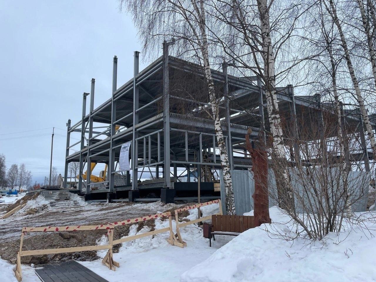 На строительстве дома культуры в Пинеге готов фундамент, специалисты возводят металлический каркас здания