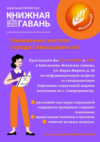 22 сентября в 17:00 в библиотеке «Книжная гавань» (улица Карла Маркса, 26) специалисты отделения социальной защиты населения по городу Северодвинску расскажут о мерах социальной поддержки гражданам старшего поколения.