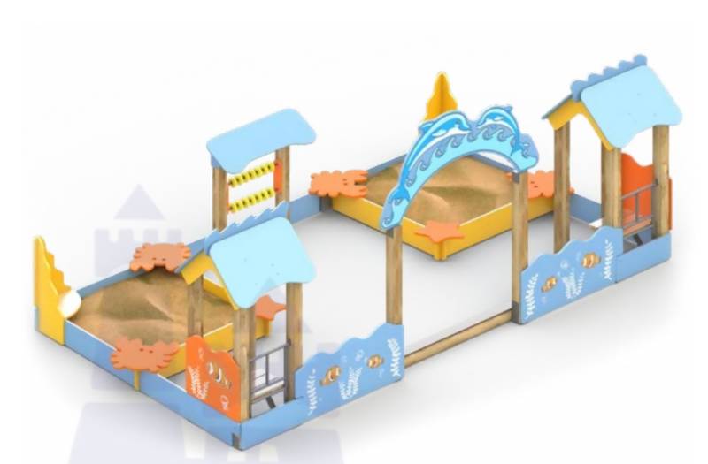 В проекте песочного дворика – две песочницы по 12 кубометров, счёты, два домика со скамейками и декоративный забор с высокой аркой. Чтобы малыши не скучали, песочницы украшены морскими обитателями: морскими звёздами, крабами и рыбками.