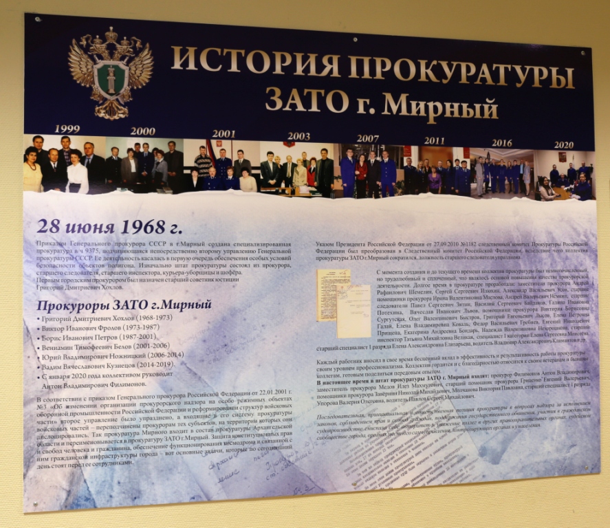 За более чем полвека менялось и название, и структура организации. Так, в 2001 году второе управление Генеральной прокуратуры было упразднено, а входящие в его систему прокуратуры войсковых частей переподчинены прокуратурам тех субъектов Федерации, на территории которых они дислоцировались, – прокуратура ЗАТО г. Мирный получила свое наименование и вошла в состав прокуратуры Архангельской области.