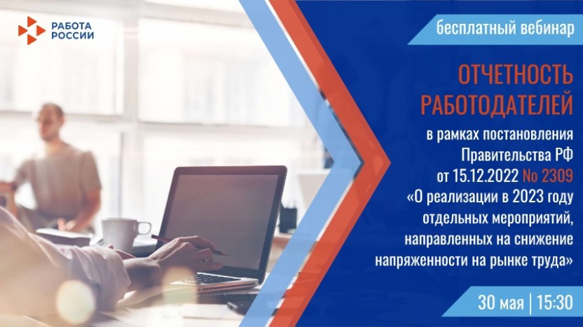 Тема вебинара: «Отчётность работодателей в рамках постановления Правительства Российской Федерации от 15 декабря 2022 № 2309 «О реализации в 2023 году отдельных мероприятий, направленных на снижение напряженности на рынке труда».
