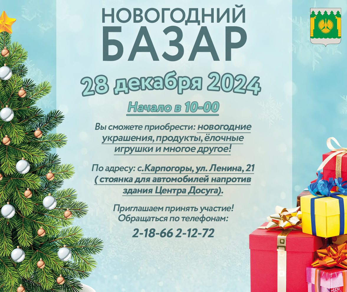 Приглашаем организации, индивидуальных предпринимателей, жителей и гостей района принять участие в ярмарке «Новогодний базар», которая состоится 28 декабря 2024 года в с.Карпогоры, ул. Ленина,21