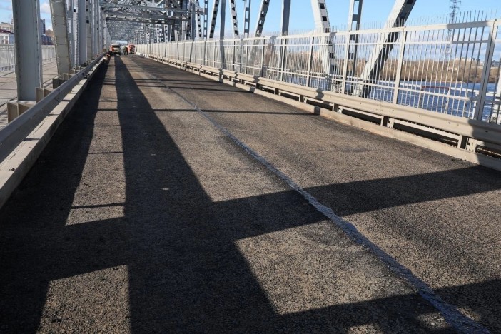 Объект был сложный с точки зрения организации ремонтных работ: требовалось постоянно уравновешивать стороны пролёта, грамотно расставлять технику, взвешивать и распределять асфальтобетонную смесь. Как планировалось, перед асфальтированием подрядчик заменил гидроизоляционное полотно.
