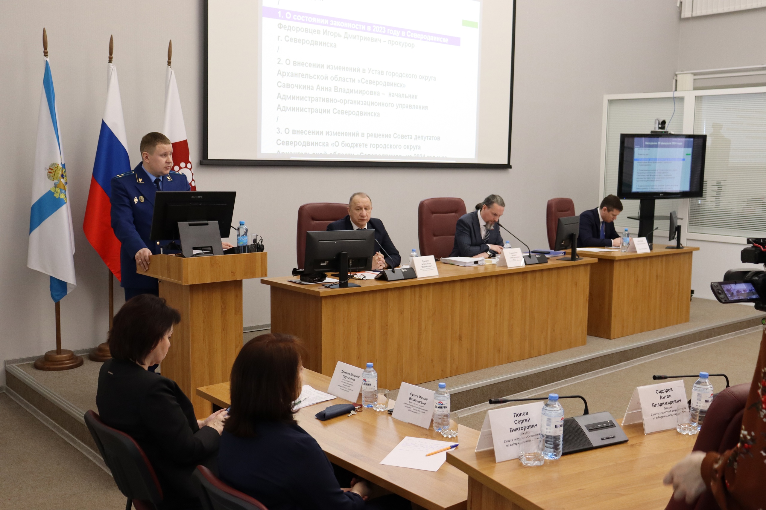На очередном заседании горсовета депутаты рассмотрели 8 вопросов. Первым вопросом повестки дня депутаты заслушали отчет о состоянии законности и правопорядка на территории Северодвинска в 2023 году.