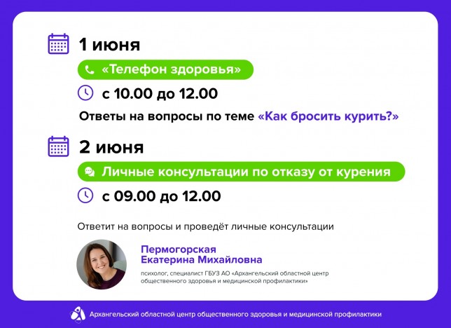1 июня с 10:00 до 12:00 с зависимостью от табакокурения поможет разобраться психолог, специалист центра общественного здоровья Екатерина Пермогорская. Телефон для связи: 8 (8182) 21-30-36.