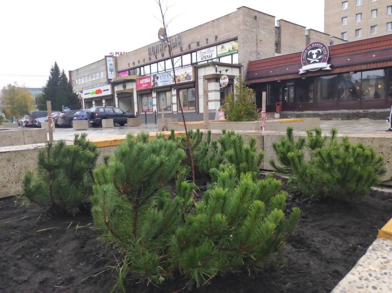 Ранее были высажены спиреи и пузыреплодник. Сейчас у торового центра появились горные сосны, барбарис, спирея и калина.