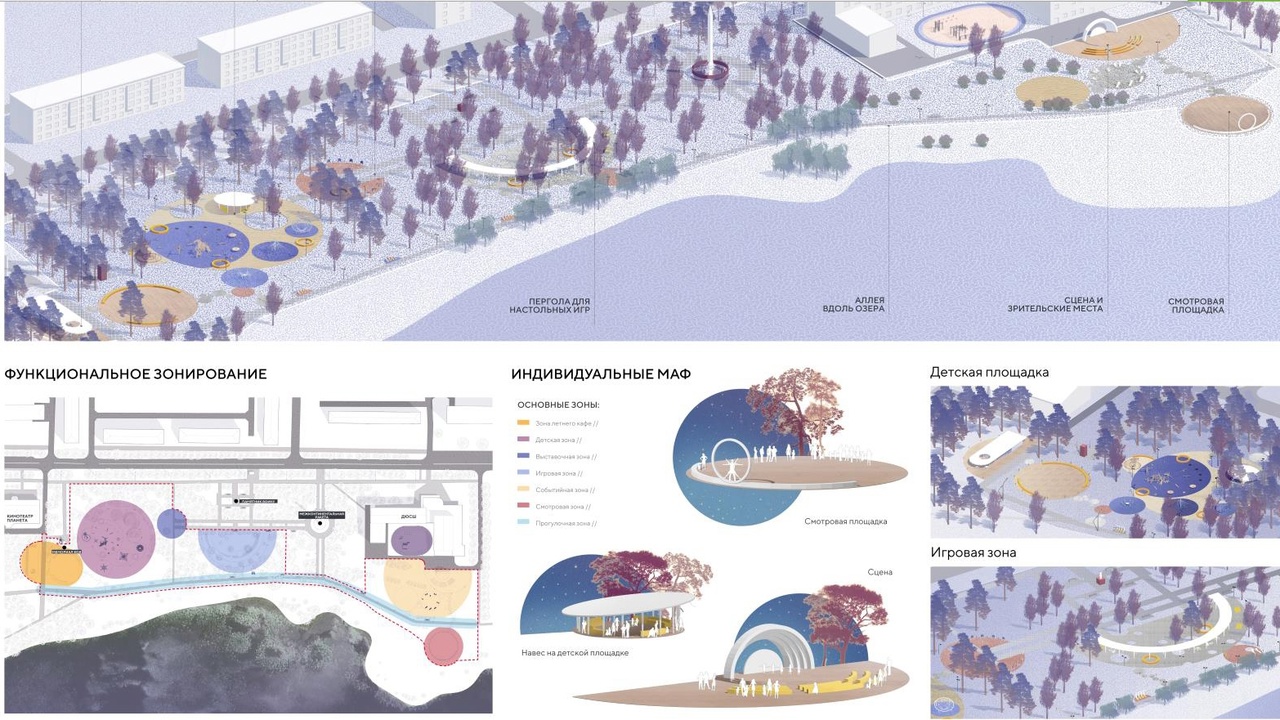 Проект предусматривает благоустройство отдельных участков рекреационной зоны. Авторы концепции постарались максимально сохранить природный ландшафт, но при этом не только облагородить внешний вид парка, но и сделать территорию комфортной и функциональной. На участке от Детской школы искусств до кинотеатра «Планета» появятся укрытия от непогоды, новая современная детская площадка, небольшое кафе с летней верандой и другие объекты. Концепция полностью пронизана космической тематикой.