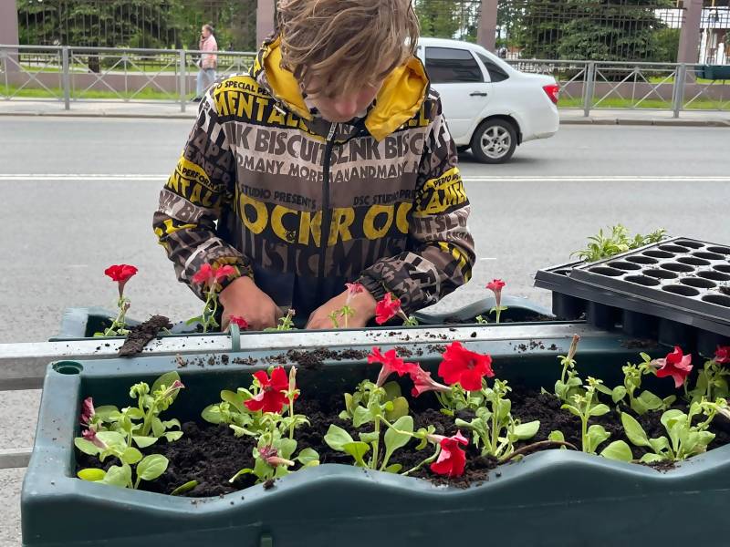 Сегодня высадили цветы в подвесные цветочницы на леерных ограждениях по Троицкому. Вдоль дорог будет установлено более 50 вазонов и цветочниц.