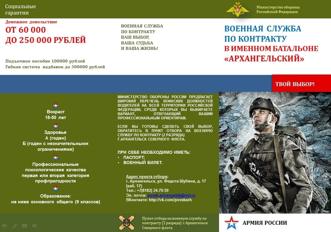 Претенденты на службу по контракту могут обращаться к специалистам ВУС по месту жительства или по адресу: Военный комиссариат Вилегодского и Ленского районов Архангельской области
