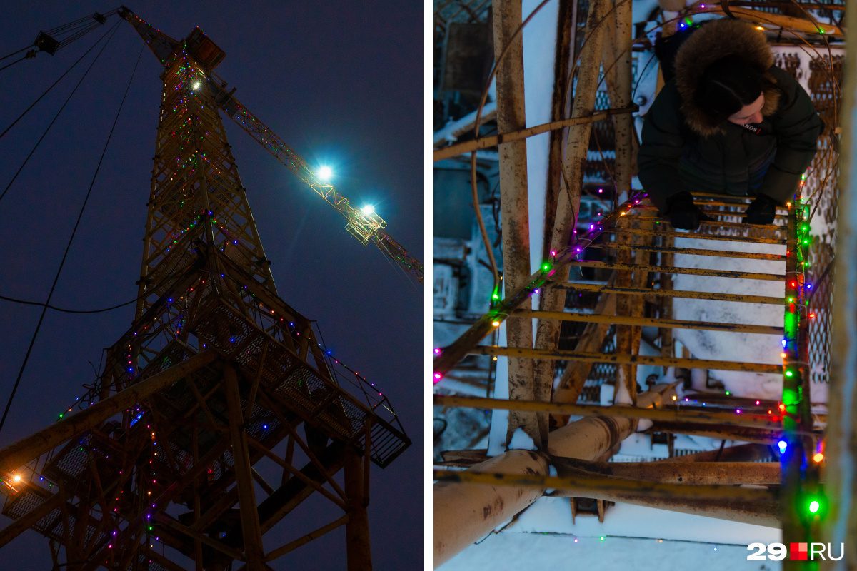 Житель Архангельска украсил гирляндами строительные краны. Мы залезли на них и сфотографировали