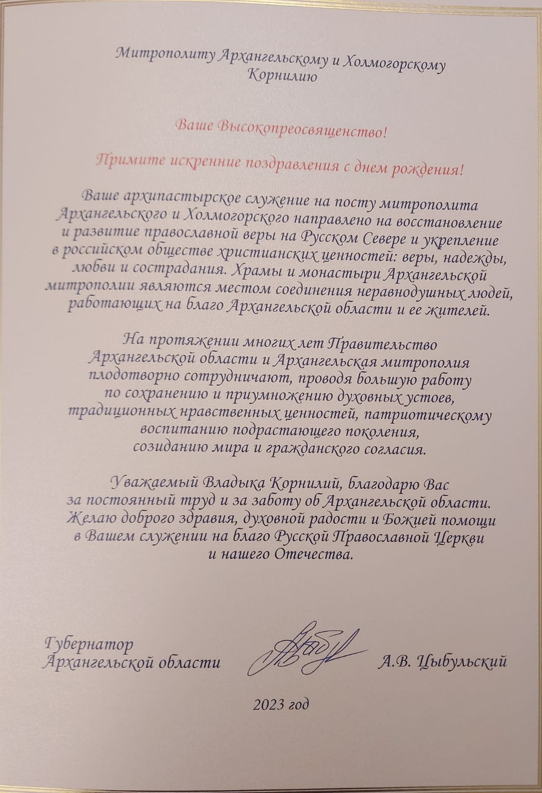 Уважаемый Владыка Корнилий, благодарю Вас за постоянный труд и за заботу об Архангельской области. Желаю доброго здравия, духовной радости и Божией помощи в Вашем служении на благо Русской Православной Церкви и нашего Отечества.