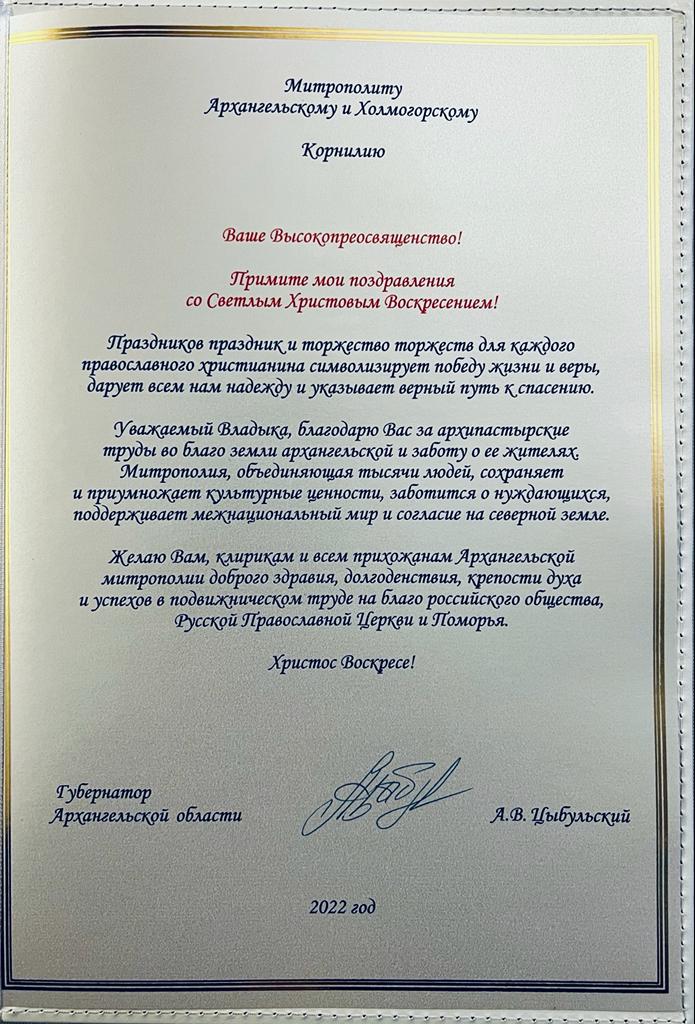 Губернатор Архангельской области Александр Цыбульский 24 апреля поздравил митрополита Архангельского и Холмогорского Корнилия с праздником Светлого Христова Воскресения. Приводим полный текст поздравления главы региона.