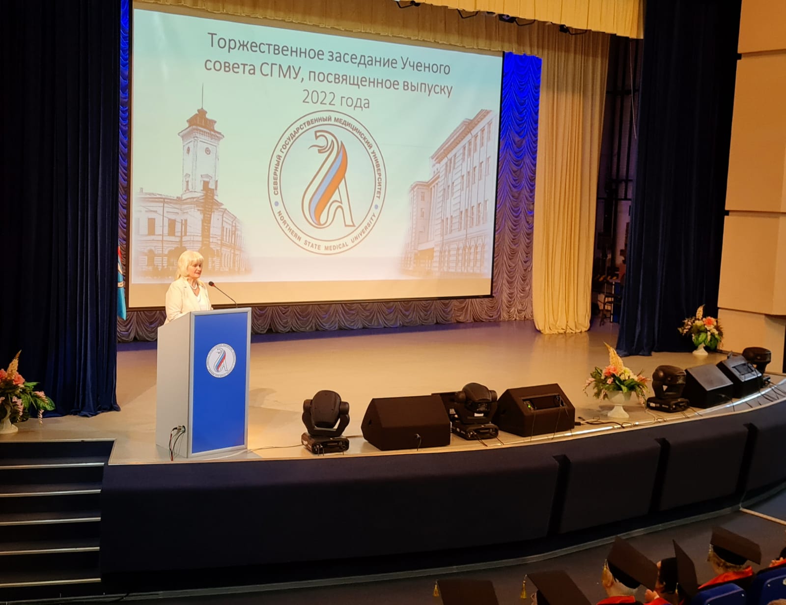 Отметим, что торжественное заседание Ученого совета Северного государственного медицинского университета было посвящено 89 выпуску врачей-лечебников (152 чел.), 40 выпуску врачей-педиатров (80 чел.), 60 выпуску врачей-стоматологов, (97 чел.), 14 выпуску врачей биохимиков (14 ч.), 19 выпуску врачей по общей гигиене, по эпидемиологии (18 чел.), 14 выпуску провизоров (16 чел.), 17 выпуску врачей-лечебников международного факультета врача общей практики (181чел.)