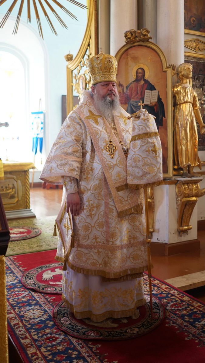Владыке сослужили клирики епархии, пел архиерейский хор под управлением Татьяны Горшковой. Проповедь по запричастном стихе произнес игумен Феодосий (Нестеров).