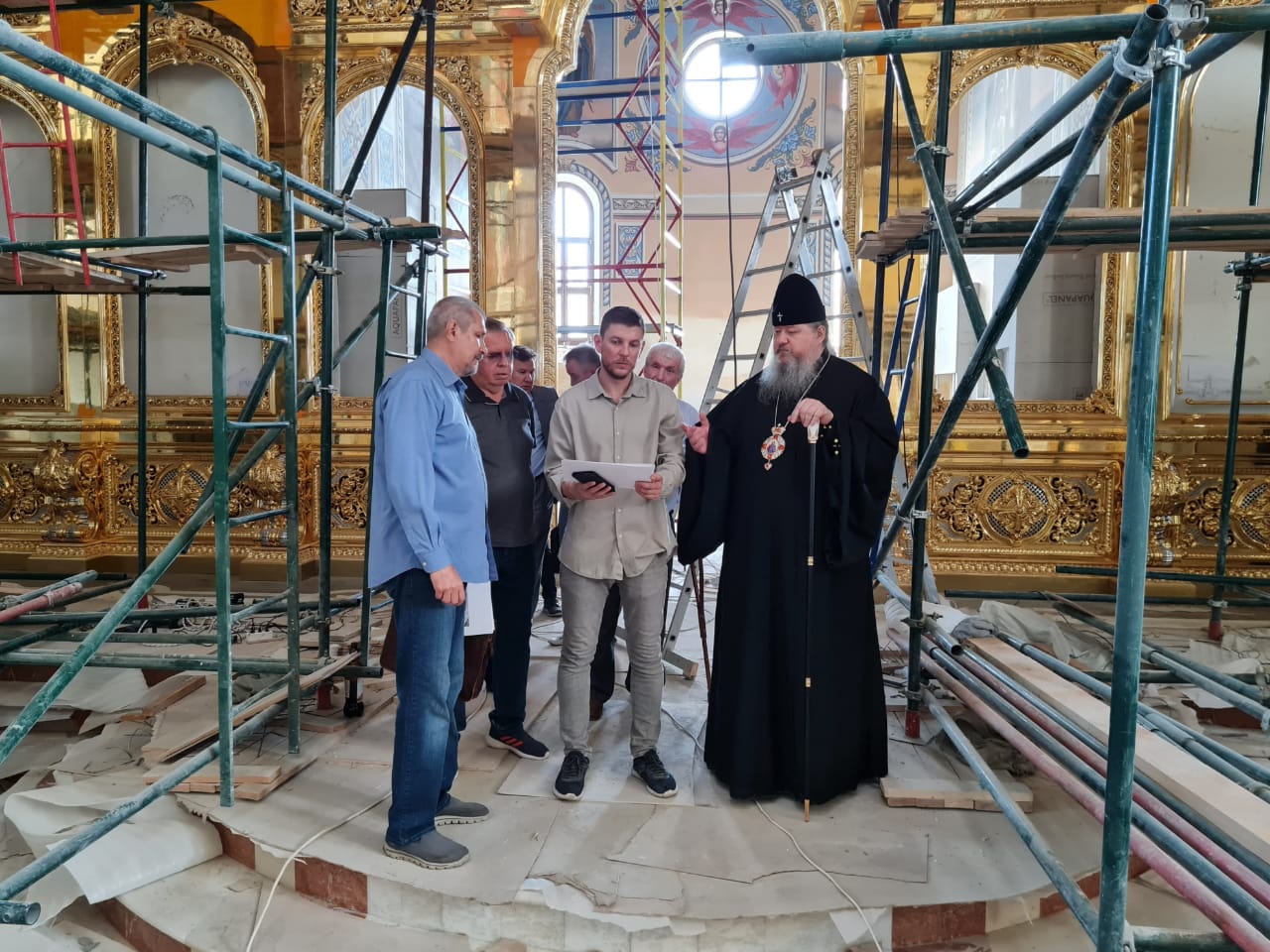 Участники совещания обсудили строительные работы, завершающиеся в храме, и продолжение художественного оформления. До конца июля специалисты завершат монтаж пятиярусного иконостаса. Художники продолжают расписывать в академическом стиле стены собора, каменный пол установлен практически полностью, установлены все паникадила.