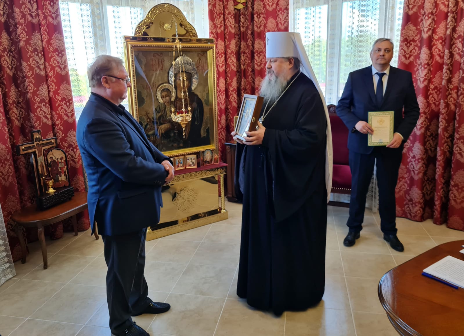 В епархиальном управлении Сергей Вадимович вручил Его Высокопреосвященству памятный знак «Орден великого князя Сергея Александровича» и поблагодарил за всемерную поддержку деятельности Императорского православного палестинского общества. Митрополит Корнилий сердечно поблагодарил Сергея Степашина за высокую награду и благословил его иконой Пресвятой Богородицы «Достойно есть», празднование в честь которой совершается в этот день.
