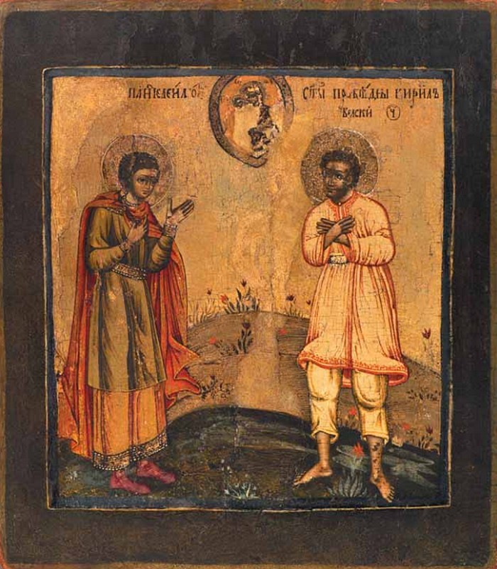 Святой Пантелеймон и Кирилл Вельский. Русский Север. XVIII в. Поступила от В. Ф. Кулакова (г. Вельск) в 1920-е гг. Из фондов Вельского краеведческого музея.