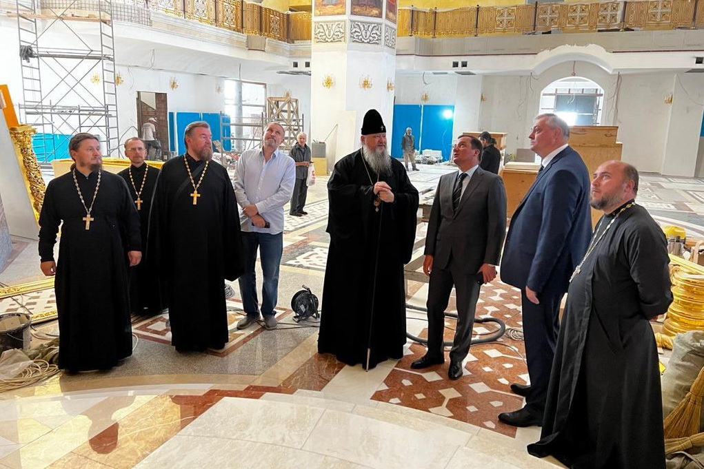 Глава региона и архипастырь проинспектировали выполняемые подрядчиками работы. Также были определены планы дальнейшей деятельности, направленной на завершение строительства главного храма Архангельской епархии.