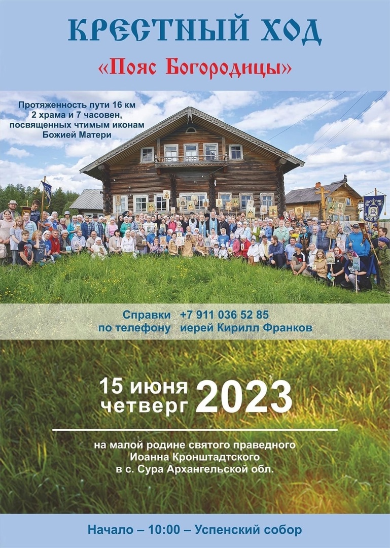 Шестнадцатикилометровый крестный ход вдоль часовен и храмов архитектурного комплекса «Пояс Пресвятой Богородицы» пройдет 15 июня в окрестностях пинежской Суры. Событие благословил митрополит Архангельский и Холмогорский Корнилий.