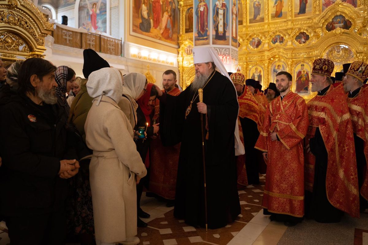 По окончании богослужения секретарь епархиального управления протоиерей Валерий Суворов от лица духовенства и мирян епархии поздравил митрополита Корнилия со Светлым праздником Пасхи.