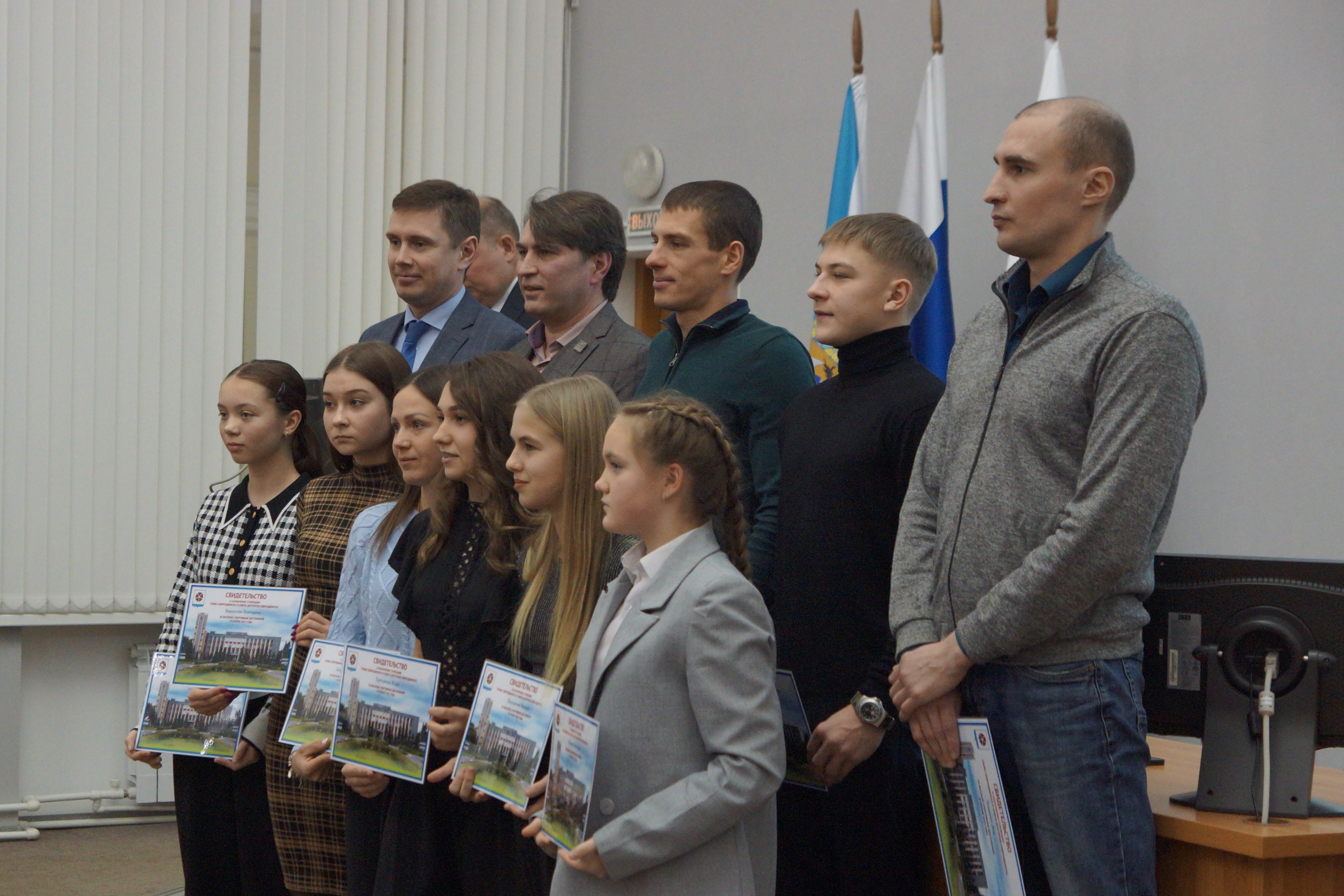Свидетельства о назначении стипендии Главы Северодвинска и Совета депутатов Северодвинска вручены спортсменам: Камиле Ашурбековой, Владиславу Осипову, Юлии Третьяковой, Алексею Шемякину, Светланк Заборской, Варваре Кокшаровой, Софии Кудерской, Льву Черевко, Екатерине Бархатовой, Виктории Новиковой.