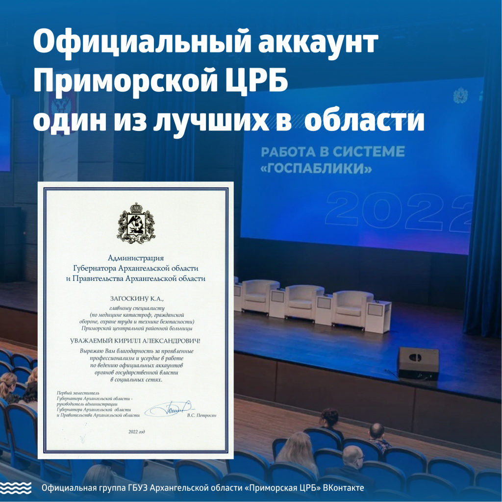 На состоявшемся 22 декабря 2022 года Форуме "Госпаблики Архангельской области", организованного Центром управления регионом Архангельской области . Официальный аккаунт Приморской ЦРБ был назван одним из лучших в Архангельской области в 2022 году.