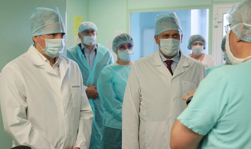 Главы регионов осмотрели основные помещения нового здания, а также наиболее насыщенные высокотехнологичным оборудованием отделения: онкогематологии, реанимации и интенсивной терапии, операционный блок с пятью операционными и послеоперационными палатами.