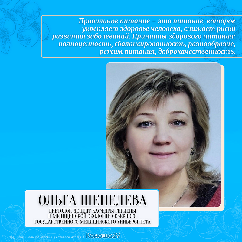 Правильное питание – это питание, которое укрепляет здоровье человека, снижает риски развития заболеваний. Принципы здорового питания: полноценность, сбалансированность, разнообразие, режим питания, доброкачественность. А также важно снижать употребление пищевых продуктов, содержащих насыщенные жиры и скрытые сахара, ограничивать соль и легкоусвояемые углеводы. Для приготовления блюд лучше использовать щадящие методы – варка, готовка на пару, тушение, запекание. Как можно реже жарить. Нарушение принципов здорового питания может приводить к развитию гиповитаминозов, белковой недостаточности и ожирения, увеличивать вероятность развития заболеваний сердечно-сосудистой системы и желудочно-кишечного тракта, сахарного диабета второго типа, остеопороза.