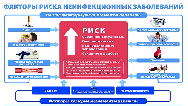 К основным типам ХНИЗ относятся болезни системы кровообращения, злокачественные новообразования, болезни органов дыхания и сахарный диабет. 50% вклада в развитие ХНИЗ вносят основные 7 факторов риска; курение, нерациональное питание, низкая физическая активность, избыточное потребление алкоголя, повышенный уровень артериального давления, повышенный уровень холестерина в крови, ожирение.