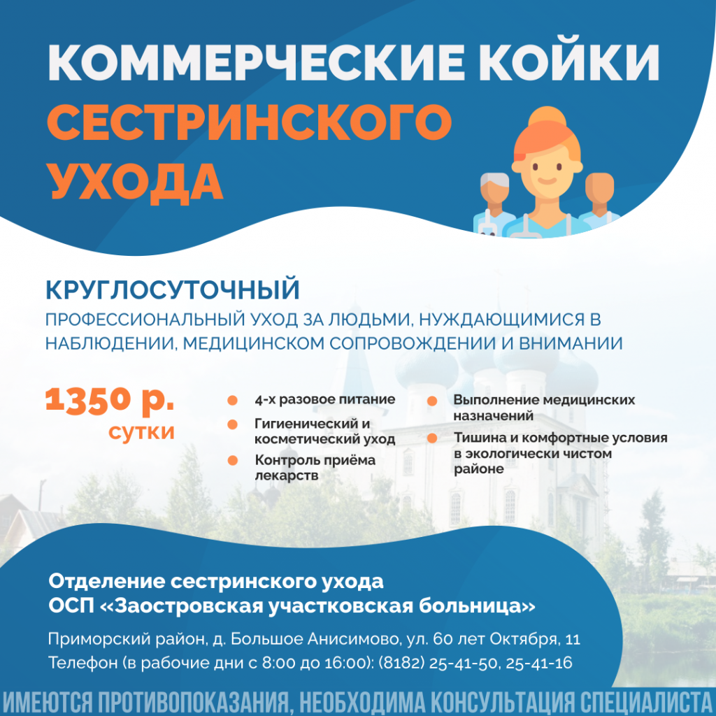 Не так страшна старость, как немощь и одиночество. Когда взрослые дети весь день на работе, внуки на учёбе, семья планирует отпуск, а за лежачими родственниками нужен уход, решение проблемы - специализированное Отделение сестринского ухода Заостровской участковой больницы в экологически чистом районе вблизи Архангельска.