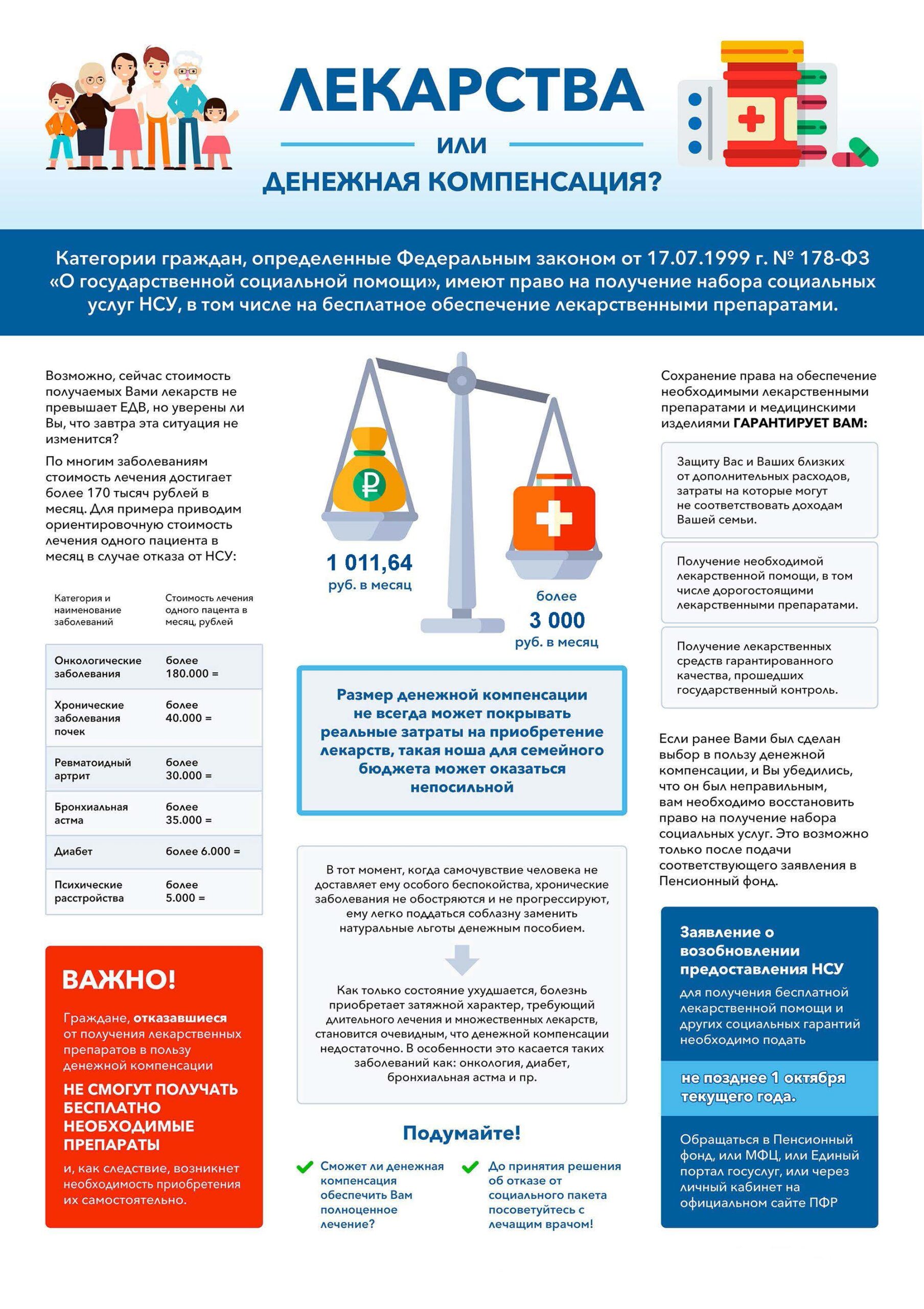 Министерство здравоохранения Архангельской области напоминает, что вы можете выбрать между лекарствами и денежной компенсацией. В карточке вы найдете информацию о преимуществах и недостатках того или иного выбора.