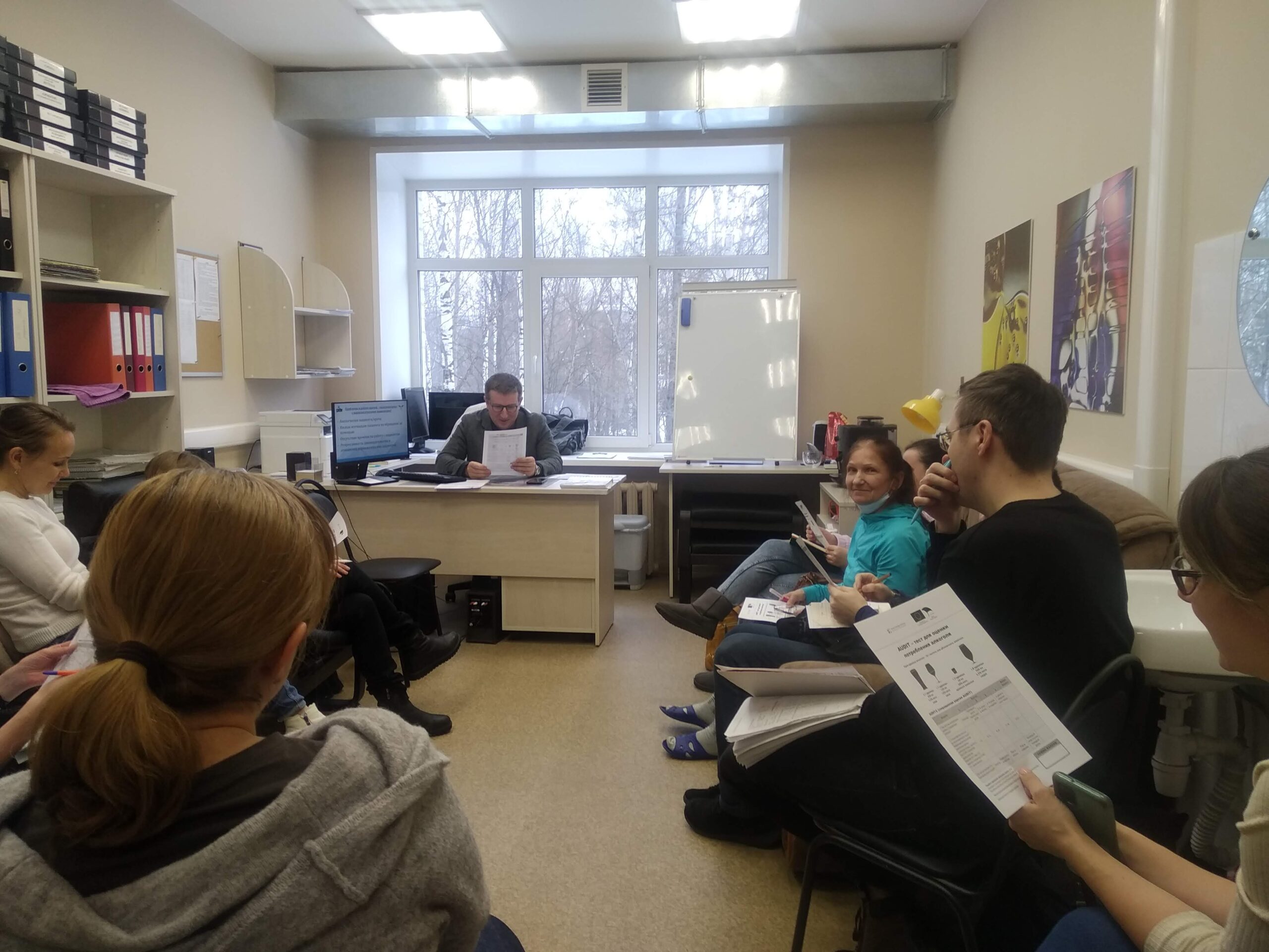 В диспансерном отделении началась программа повышения квалификации врачей общей практики. В первый день врачи знакомились с Поморской моделью. Во второй была представлена модель менеджмента агрессивного поведения и подходы в лечении пациентов с наркологическими расстройствами. Далее группы обсудят темы по работе с родителями, с родственниками; депрессии, соматизированные расстройства, профилактика суицидов, посттравматические стрессовые расстройства. Желаем успешной работы!