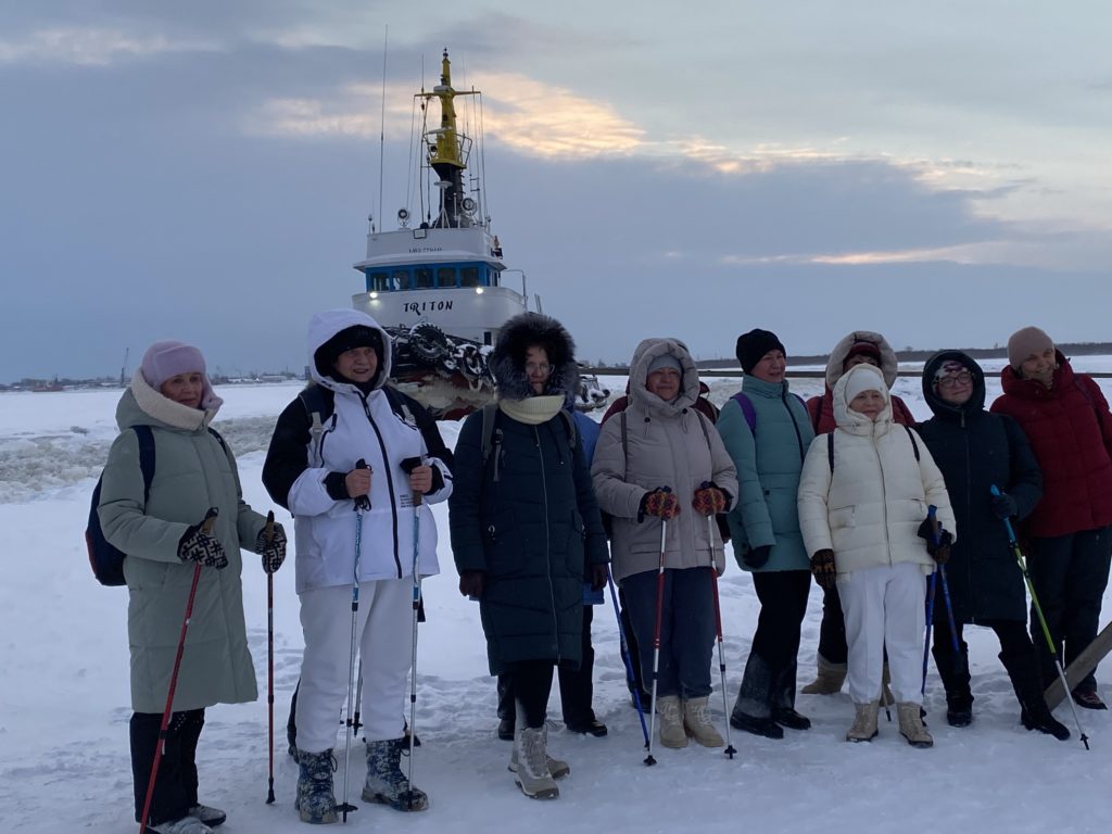 Итак, ровно в 10 утра мы собрались на спуске на реку около гостиницы «Пур-Наволок», пришли все записавшиеся на маршрут. Одеты тепло, в рюкзаках – термосы с горячим чаем и бутерброды. Все, как полагается у настоящих туристов. Наш проводник, создатель и вдохновитель мини-тура Елена Васильевна Гафарова провела инструктаж, как переходить через Двину, а еще мы немного размялись, ведь предстоял путь в десять километров. «Как хорошо, что Елена Васильевна заранее предложила идти со скандинавскими палками, они поддерживали в прямом смысле слова, ну и сердечную мышцу прокачали, здорово же!» – поделились позднее участницы маршрута.