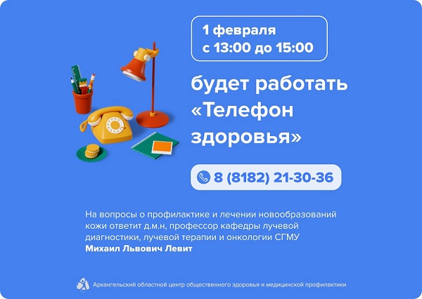 1 февраля 13:00 до 15:00 пройдёт «Телефон здоровья» по теме доброкачественных или злокачественных опухолевые поражений кожи. На вопросы ответит Левит Михаил Львович, д.м.н, профессор кафедры лучевой диагностики, лучевой терапии и онкологии СГМУ.