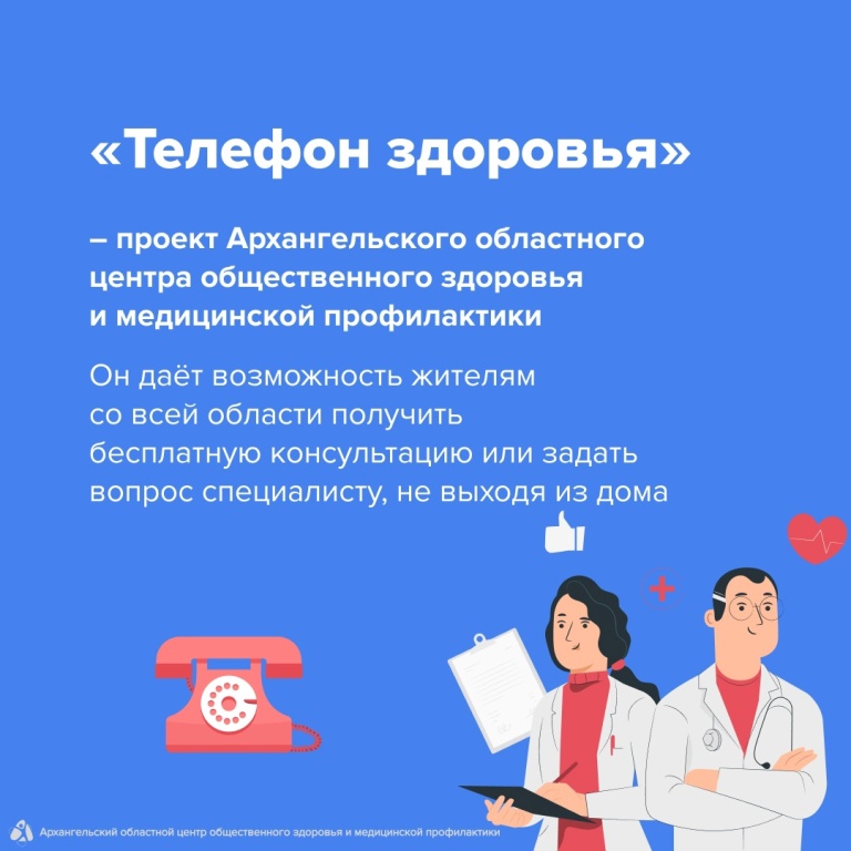 «Телефон здоровья» — проект Архангельского областного центра общественного здоровья и медицинской профилактики, который реализуется с 2009 года. Он дает возможность жителям со всей области получить бесплатную консультацию или задать вопрос специалисту, не выходя из дома.