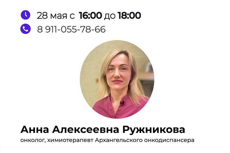 28 мая с 16:00 до 18:00 на «телефоне здоровья» дежурит Анна Ружникова – врач-онколог, химиотерапевт Архангельского клинического онкологического диспансера, кандидат медицинских наук.