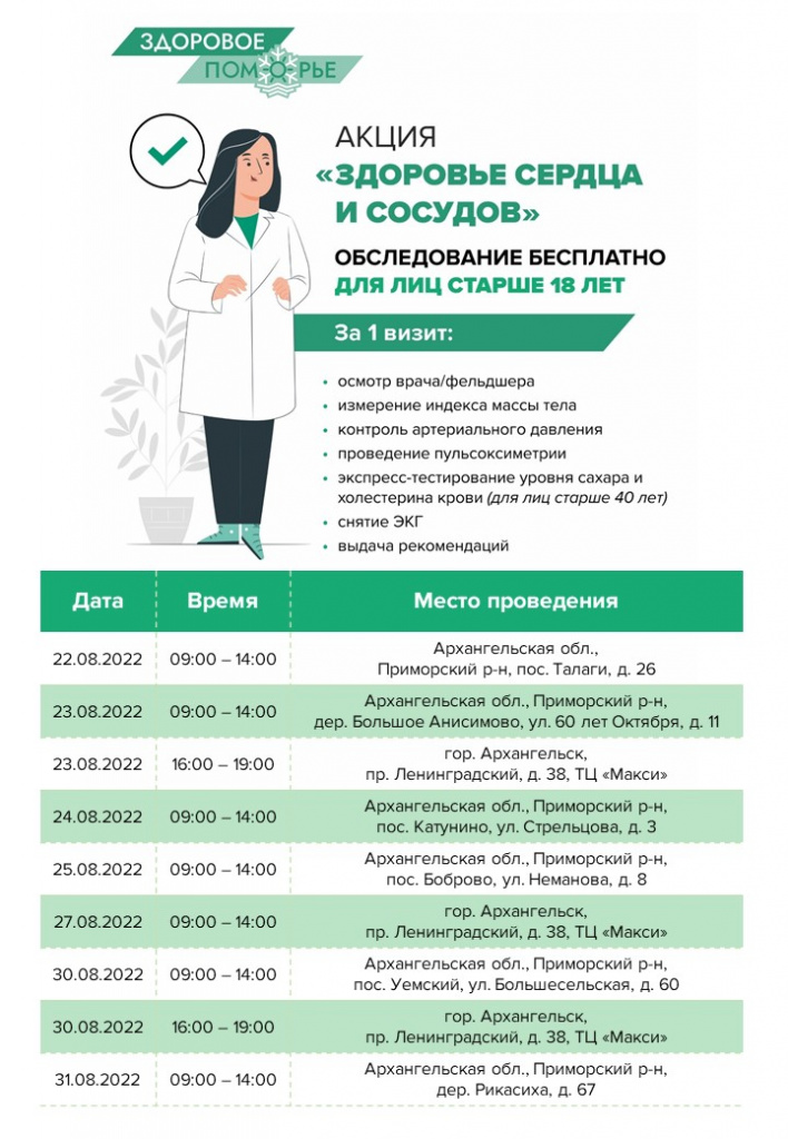 В рамках проекта «Здоровое Поморье» с 22 по 31 августа любой желающий, старше 18 лет сможет пройти обследование сердечно-сосудистой системы и получить рекомендации специалиста.