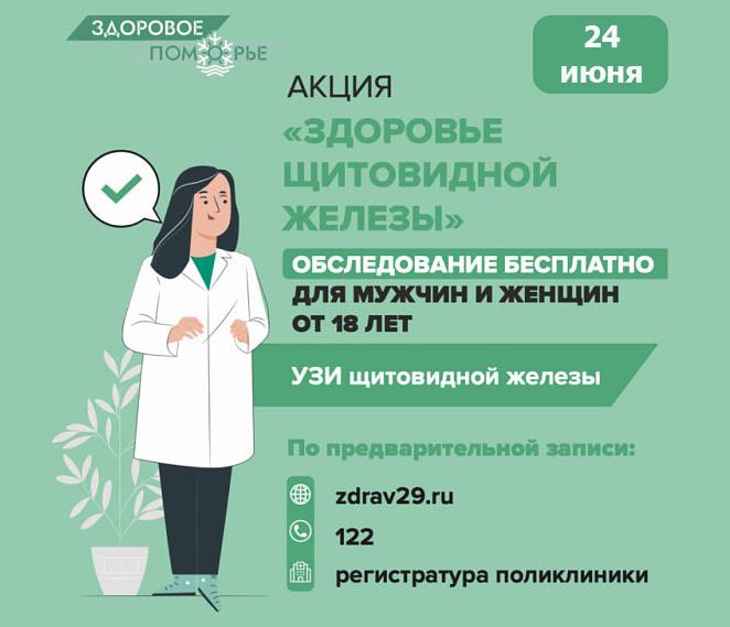В рамках губернаторской инициативы «Здоровое Поморье» бесплатно в поликлинике Яренска можно пройти УЗИ, в Урдоме и Яренске женщинам в возрасте до 45 лет также можно сдать анализ крови на тиреотропный гормон (ТТГ).