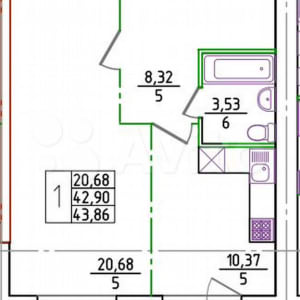 1-комнатная квартира на 3 этаже с общей площадью 43,86 кв.м. Кухня 10,37 кв.м., просторная комната площадью 20,68 кв.м. с выходом на балкон площадью 3,20 кв.м. Совмещённый санузел: площадью 3,53 кв.м.
